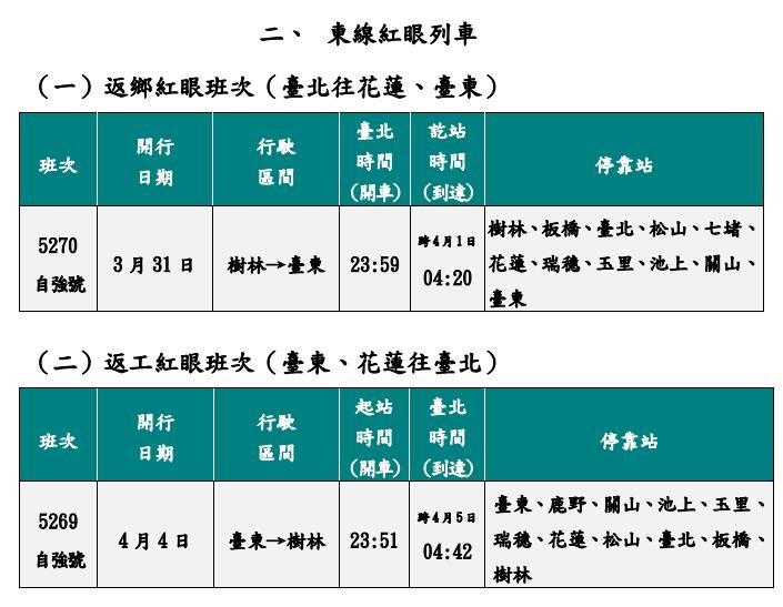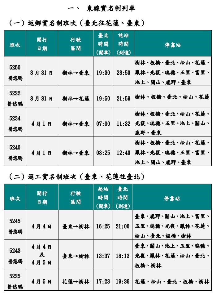 假期剛結束清明連假跟著來 台鐵3月3日零時開放訂票 |2023.03.01 語音朗讀 1217觀看次 字級 大 中 小 台鐵局今(1日)表示,因應112年清明連續假期疏運旅客需要,全線加開各級列車共計189班,3月3日零時開放訂票。圖/記者張睿杰 【本報台北訊】228連假剛結束,清明連假緊接著而來,台鐵局今(1日)表示,因應112年清明連續假期疏運旅客需要,自3月31日(星期五)起至4月6日(星期四)止計7天,全線加開各級列車共計189班,其中包含東部地區實名制列車8班、彰化-花蓮跨線EMU3000型自強號列車4班及112年4月1日~4月5日中壢-花蓮EMU900型區間快車10班、七堵-高雄EMU900型區間快車10班。台鐵局表示,為加強疏運旅客,3月31日至4月6日暫停發售親子車廂車票,改以一般車廂方式售票。圖/記者張睿杰台鐵局表示,清明連假車票自3月3日(星期五)0時起,開放網路、台鐵e訂通、超商及電話語音訂票;另東線實名制列車班次,於3月4日(星期六)0時起,開放111年8月1日前(配合內政部更新「個人資料取得媒介」政策)設籍於花蓮縣、台東縣之現住人口與國民身分證統一編號第1碼為U或V及上開兩者之配偶與直系血親1親等國民訂票。相關加開列車車次、時刻,即日起可於台鐵局官網(網址:http://www.railway.gov.tw)及訂票APP「台鐵e訂通」查詢。圖/台鐵局提供 前一篇文章 新聞千里眼 下一篇文章 射擊飛靶亞洲盃 楊昆弼勇奪金牌 熱門新聞 01【傳燈六十‧百年仰望】星雲大師一筆字書法紀念特展概述2026.01.3002澳網 辛納拚3連霸 小蠻牛盼全滿貫2026.01.3003【紀實攝影】花蓮月光寺 台灣後山的人間淨土2026.02.0104土方之亂推高成本 房價漲壓浮現2026.02.0205佛光山大雄寶殿 逾千僧信迎萬佛2026.02.0106針灸醫療 助癱瘓大象站起來2026.01.3107沙漠獅變海洋獅 為人類上了一課2026.02.0108淨心是最好的預防醫學 洛桑加參:找回不生病的力量2026.01.3109【人間行者心】一鏟一撬,心路通行2026.02.0110【詩】清晨的籤詩2026.01.30 訂閱電子報 台北市 天氣預報 台灣一週天氣預報 相關報導 蕭旭岑會王滬寧 強調一中各表蕭:兩岸合作賺世界錢國共論壇登場 藍:兩岸露暖意競選總部成立 黃國昌:3階段推藍白合黃仁勳兆元宴 供應鏈高層到場海鯤艦2度潛航測試 軍事迷喊加油