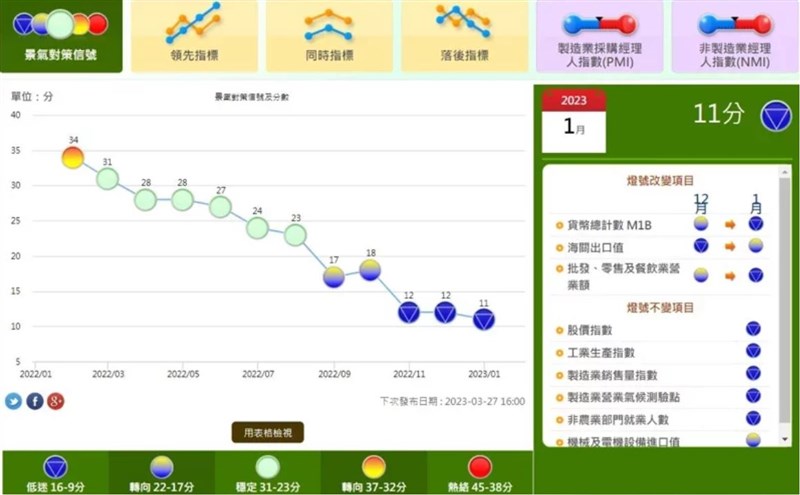 【本報台北訊】景氣又更糟了,國發會今(1)日發布2023年1月景氣燈號,受通膨及升息影響,全球經濟成長動能疲弱,終端市場需求低迷,且產業鏈持續調整庫存,使得1月生產面、貿易面、金融面、信心面指標均續呈疲弱,使得今年1月景氣對策信號綜合判斷分數為11分,較去年12月減少1分,亮出第三顆代表「景氣低迷」的藍燈。