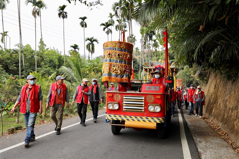 早期遶境都是由人力扛轎,後來隨著時代變遷,改成由鐵牛車或貨車來拖行神轎,形成獨特的鐵牛車拖行神轎遶境情景。圖/縣府提供