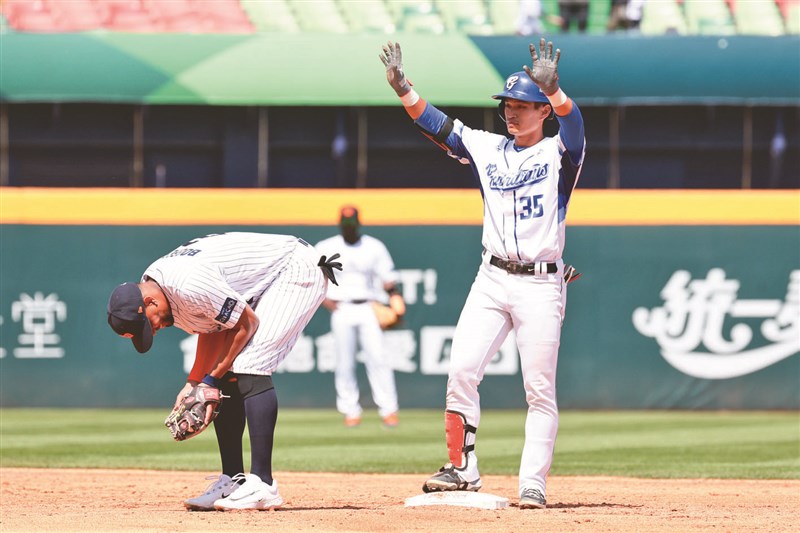 富邦悍將王正棠(右)第三局敲安,助球隊先馳得點。