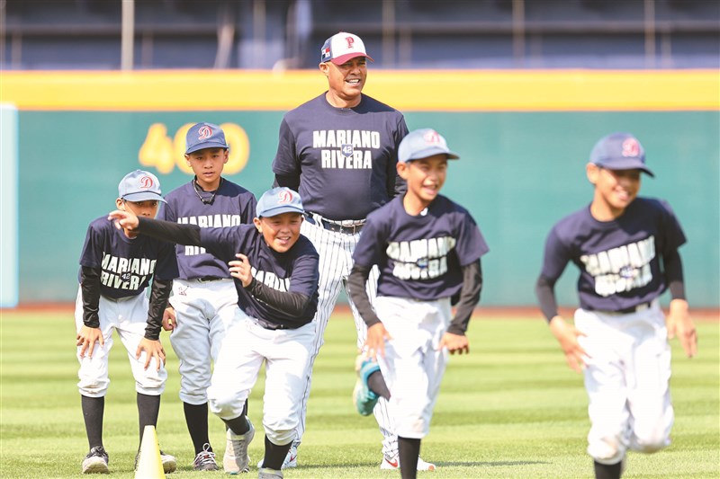 MLB傳奇守護神李維拉,昨與參加棒球訓練營的小朋友開心互動。圖/中央社