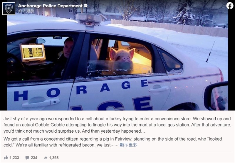 上班途中驚見「會走的冷凍豬」 急忙報警尋獲飼主 |2023.03.09 語音朗讀 2372觀看次 字級 大 中 小 美國近日有一件趣事,男子帶愛犬出門驚見一隻已經「凍成冰塊的豬在路上行走」,嘴巴還嚼著雪吃,嚇得他立刻報警。 圖/fb Nolan Boedigheimer 【本報綜合報導】一名男子日前帶愛犬出門,驚見一隻已經凍成冰塊的豬在路上行走,嘴巴還嚼著雪吃,嚇得他立刻報警,這才發現原來這隻豬是別人的寵物豬,因為太貪吃所以跑到路上來覓食。美國阿拉斯加州一名30歲男子波狄格海默(Nolan Boedigheimer)2月14日當天帶著愛犬出門上班,結果狗狗在半路上突然狂吠起來,他仔細一看路上竟然有一隻豬,這隻豬在天寒地凍的天氣中全身結霜,竟然還有生命跡象不斷吞食著路上的雪,隨後這隻豬就慢慢走到波狄格海默的車前面晃來晃去,嚇得他立刻報警處理。波狄格海默將這隻「冷凍豬」的模樣拍下來上傳到臉書,希望網友們可以幫忙轉發找到主人,豬隻則暫時先安置在警察局。安克拉治警察局(Anchorage Police Department)也協助發文轉PO照片,警方說,從沒想到有一天竟然會發布這樣的協尋失蹤豬的文章」。後來小豬的主人赫雷拉(Angela Mullen-Herrera)看到網路上的貼文,立刻跑到安克拉治警察局認領寵物豬回家,小豬也結束了在冰天雪地覓食的奇遇。赫雷拉表示,這隻4歲的寵物豬名叫艾維斯皮格斯利(Elvis Pigsley),是為了紀念知名歌手貓王而取的諧音名字,但這已經不是牠第一次離家出走,因為牠很喜歡人類跟食物,所以常常逃家去尋找有更多食物的地方。 前一篇文章 老翁隨宋江陣遶境迷路 警熱心助與家人團聚 下一篇文章 真實童話!瀕死白鶴被救康復後成家人流傳佳話 熱門新聞 01記得與忘記2026.01.0802悍將、雄鷹補戰力 拚闖季後賽2026.01.0903南投山區 梅花盛開2026.01.0704【愛的樣貌】平凡裡沉澱出深情2026.01.0605台水潮州營運所落成 佛光山灑淨2026.01.0906百馬剪紙 法水寺非遺藝術展2026.01.0607全球最長壽貓 30歲等同120歲人瑞2026.01.0808星雲大師全集【傳記】百年佛緣─生活篇 僧情不比俗情濃—我對感情的看法 4 - 12026.01.0609星雲大師全集【傳記】百年佛緣─生活篇 僧情不比俗情濃—我對感情的看法 4-22026.01.0710三寶寺護法委員餐會 凝聚長期護持力量2026.01.07 訂閱電子報 台北市 天氣預報 台灣一週天氣預報 相關報導 耿慶芝 樂當台土文化交流義工社區壁畫 改造人心Fiona Hsu 貝里斯打造藝術花園包錦蓉:我可以逆風高飛