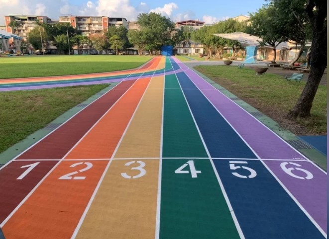 【本報台北訊】為提供學童優質運動場地,新北市去年向教育部申請「運動操場及周邊設施整建計畫」 經費,花費近6億元,整修74所學校操場,目前已全數完工。其中,汐止白雲國小全新的「彩虹跑道」色彩繽紛彰顯校園活力與朝氣,6色跑道設計象徵該校多元課程規劃,希望讓學生的未來發展如同彩虹鮮豔奪目。