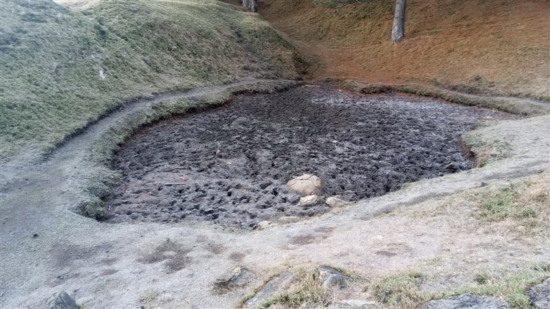 老天不下雨,玉山塔塔加遊憩區不只步道面上易燃的松脂點布,水源指標鹿林山看天池也乾涸了。圖/玉管處提供