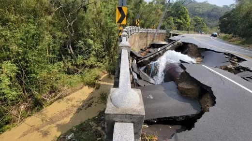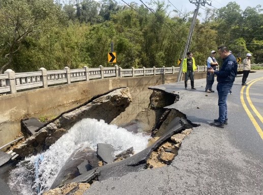 新竹縣政府表示,寶二水庫輸水管今天破裂,造成道路受損中斷,擋土牆損毀約100米,目前搶修中。自來水公司已經暫時關閉水閥,備料修復輸水管,維持當地通行安全,縣府開口廠商隨時待命支援,經濟部水利署北區水資源局將負責後續擋土牆及路面修復。