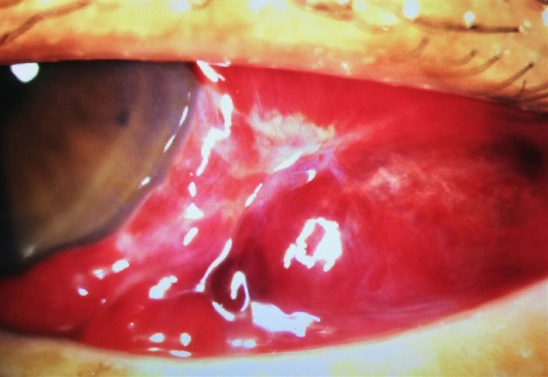詎料,陳女於就醫5天後匆忙回診,而且原先的結膜下出血變得更嚴重,外觀已成了一顆深紅色的眼睛。