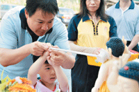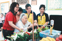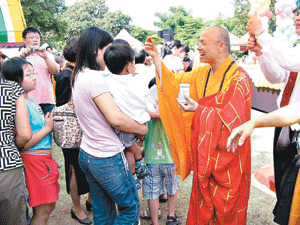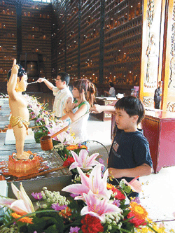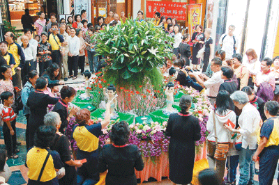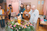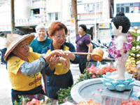 一年一次,我要趕緊來浴佛 |2008.05.12 語音朗讀 3006觀看次 字級 大 中 小 扶老攜幼的民眾,依序禮佛並以淨水為太子佛像淨身。人間社記者江峰平攝【人間社綜合報導】「佛祖來了,佛祖來了,佛祖來保佑我們國泰民安、風調雨順,大家趕快來浴佛喔!」佛光山各道場、佛光會各分會為慶祝佛誕節,同步舉辦雲水佛誕車浴佛法會,也為普天下母親祈福,感念佛恩與慈恩,同時推動「就素要慈悲」,呼籲全民發願吃素活動,提高減碳運動的成效。塗抹身心 洗滌污垢佛光山十至十二日於大雄寶殿設置浴佛台,供遊客、信徒浴佛淨心。圖/佛光山提供「我今灌沐諸如來,淨智莊嚴功德海,五濁眾生離塵垢,同證如來淨法身。」全台各分會到市場、社區、公家機關舉辦雲水浴佛活動,悠揚的浴佛偈樂音流淌而出,吸引無數民眾前往,尤其在人潮鼎沸的市場,生意人及過往民眾無不駐足,歡喜允諾。「阿彌陀佛,一年一次,我要趕緊來洗佛囉!」也有菜販取浴佛水往臉部或身上塗抹,洗滌身心污垢。(陳賽香、王美蘭、張大張)家住桃園的陳先生一家六口到鶯歌老街遊玩,巧遇浴佛活動,如獲至寶般欣表示:「浴佛的時候,心中觀想洗去不好的習氣和煩惱,當下身心頓覺清涼,感覺有如脫胎換骨般的輕鬆自在,猶如重生!」(呂清月)苗栗二、三分會舉辦雲水浴佛車巡迴遶境,於玉清宮前舉行啟程儀式,隨即展開活動,頭屋鄉五聖宮醒獅團恰好經過,也停下來舞獅禮拜佛陀;副縣長林久翔率領縣府多位一、二級主管,苗栗市長鄒玉梅帶領市公所同仁參加。(張清川)屏東新埤、佳冬、枋寮、南州、東港分會分別舉行雲水佛誕車遶境,繞境範圍近五十個村落,許多鄉民設香案燒香祝禱。枋寮分會除了引導大眾浴佛外,也送上康乃馨,表達對天下母親的敬意。(心嵩)年輕學子 福氣十足基隆極樂寺、七堵分會在基隆百福國中舉辦「浴佛祈福包高『粽』活動』,校長朱憲瑾祝福考生都能考取理想的學校,並對佛光會員無私奉獻的精神,表達肯定與感激。(李梅珍)東吳大學香海社五日起連續一周,於校區雙溪藝廊舉辦佛誕周,提供祈福小卡;正值校區舉行「社團特色競賽」,香海社員也參與競賽活動,以《佛陀傳》為劇本,用輕鬆活潑,獨特又不失莊嚴的方式呈現。(轉韻)台南第二分會十日在和順國中舉辦佛誕節慶祝活動,校長潘明智感謝福國寺給予全校師生參與此次活動的因緣,同時頒發感謝狀予安南二會,由會長林←雲代表接受,感謝佛光會捐款給學校作仁愛教育基金。(怡芬)蘭陽區各道場及各分會在佛光大學舉辦浴佛暨園遊會,佛大師生每人獲贈一百元點券,品嘗二十一個攤位美食,同學讚不絕口。校長翁政義表示,藉佛陀的慈光,讓年輕學子在這清淨美好的環境中學習,可說是大家的福氣。(張玉琳、吳銘澤、周俊雄)受刑人 覺今是而昨非台南少觀所同學以親自泡的茶湯先供佛,表達心中虔誠恭敬。人間社記者平曜攝基隆勝鬘分會、桃園三會分別在基隆看守所、台北監獄舉辦浴佛法會,桃園三會並贈五百本《佛光菜根譚》及一百本經典與受刑人結緣。基隆看守所長黃書益對於佛光會長期耕耘監獄弘法佈教的成果深表肯定;台北監獄典獄長鄭澄清則表示,這是獄所首次舉辦,讓受刑人藉由浴佛修心去業,覺今是而昨非,走向光明的人生道路。(妙怡、謝佩蓁)中華總會副總會長陳順章及南區協會副會長楊政達與南台別院八個分會會長,到台南少觀所關懷青少年朋友,少觀所同學以親自泡茶湯供佛,表達心中恭敬。(平曜)病患及家屬 同霑法喜台北教師一、松四、北投一、松五、松隆、松三分會,在忠孝醫院、榮民總醫院、中興醫院、關渡醫院展開浴佛活動,會員將浴佛車推向各樓層,服務行動不便的住院病患及家屬同霑法喜。台北道場妙毅法師到安寧病房,為三位病患做方便皈依,帶著氧氣罩的、插著鼻胃管的病患,再三稱念「阿彌陀佛」,令人動容。在忠孝醫院,當浴佛車到大家所熟知的漸凍人陳宏老師病房,彷彿進入佛像文物為主的書房。劉學慧老師看見漸凍人王錦銘帶著氧氣罩,拒絕氣切手術,正勇敢地面對死亡,不禁悲從中來;她說面對人生「生、老、病、死」,只有皈依佛法僧三寶,才可以開智慧,洗滌心靈,吉祥如意。(性如、李素芳、曾廣慶、姜霞萍)法師體貼的牽起病友顫抖的手,引導他們浴佛。人間社記者江峰平攝台中西屯分會將莊嚴的浴佛車推到台中榮總安寧病房,當慈悲親切的法師體貼的牽起病友顫抖的雙手,引導他們一字一句說出「願斷一切惡,願修一切善,誓度一切眾生」,並依序如法浴佛時,在一旁的家屬無不感動的紅了眼眶。茶道交流及惠中學苑古箏班的古箏演奏,也為安寧病房增添柔美的氣氛。(江峰平)屏東四、花蓮二會在高屏各醫院及花蓮醫院、安養護理機構等舉辦雲水浴佛法會,無論年長、年幼,或行動不便者,在法師及幹部引導下圓滿完成浴佛儀式。(蔡素麗、陳育章)慈悲基金會與桃園三分會、中壢佛光幼童軍團前往中壢懷寧護理之家,住院患者或由家屬、護理人員、義工協助推著輪椅參與浴佛,並欣賞佛光人的精采表演。(范姜世柏)二林地區民眾扶老攜幼歡慶佛誕節,父子同結佛緣。佛光人與快官國小同學聯合攙扶長者歡喜浴佛。人間社記者賴炯福攝員林永靖分會前往彰化慈林庭園養護中心灑淨,快官國小輔導主任陳于倩也帶領十餘位同學表演舞蹈,並為長者獻上康乃馨;小朋友主動與佛光人共同牽扶長