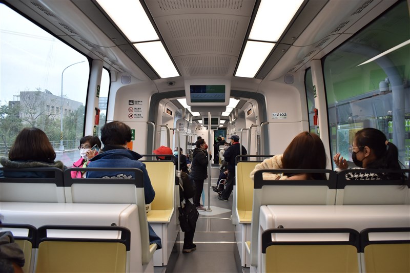 張姓女子與美國籍男友一起搭輕軌,她表示,這次從美國回台探親,剛好奶奶住在安坑地區,3人順便體驗輕軌,希望車廂內顯示各站名的電子看板能增加英文,以便外國人閱讀;美國籍男子說,能搭輕軌非常方便。
