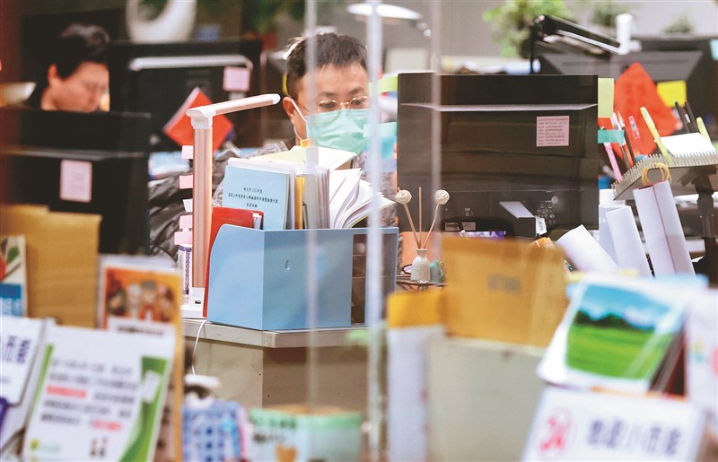 主計總處主計長朱澤民昨表示,隨著物價上漲,明年軍公教應該調薪;圖為新北某區公所員工下班時間仍在辦公。圖╱侯永全