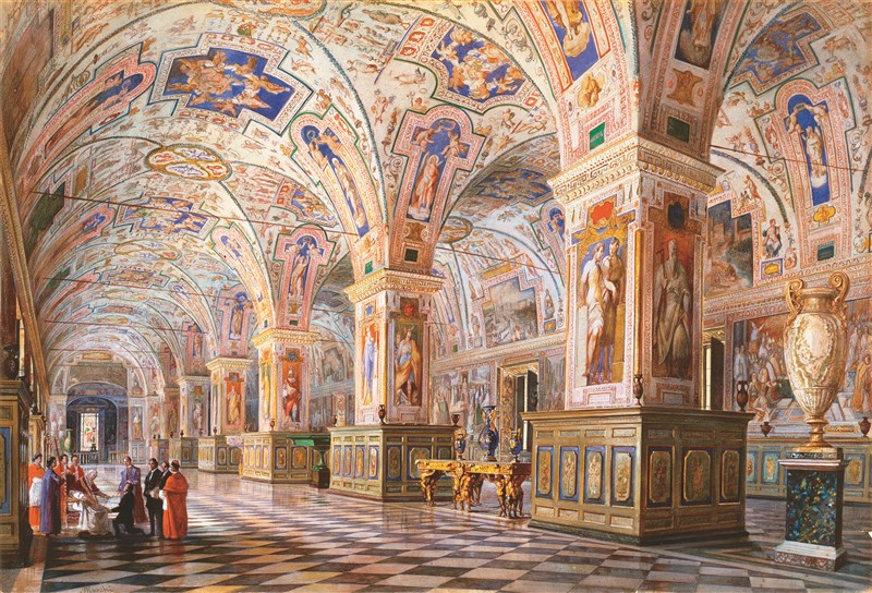 在設計者構思中,但丁《神曲》手抄本如同一部目錄,每一雙摺頁攤平後,正面可容納一整部篇章的文字,背面由山德羅.波提且利畫插圖;文森佐.馬爾基於一八六○年繪製的〈西斯汀大廳視圖〉,呈現教宗庇護九世(Pius IX)被樞機主教及高階神職人員圍繞,接受贈禮的場景。