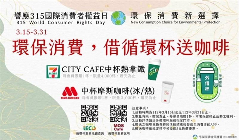 為響應315國際消費者權益日,並推廣循環杯借用,環保署與7-ELEVEN及摩斯漢堡合作,15日至31日止,體驗借用循環杯,借、還成功後就能獲 小7、摩斯咖啡1杯。圖/中央社