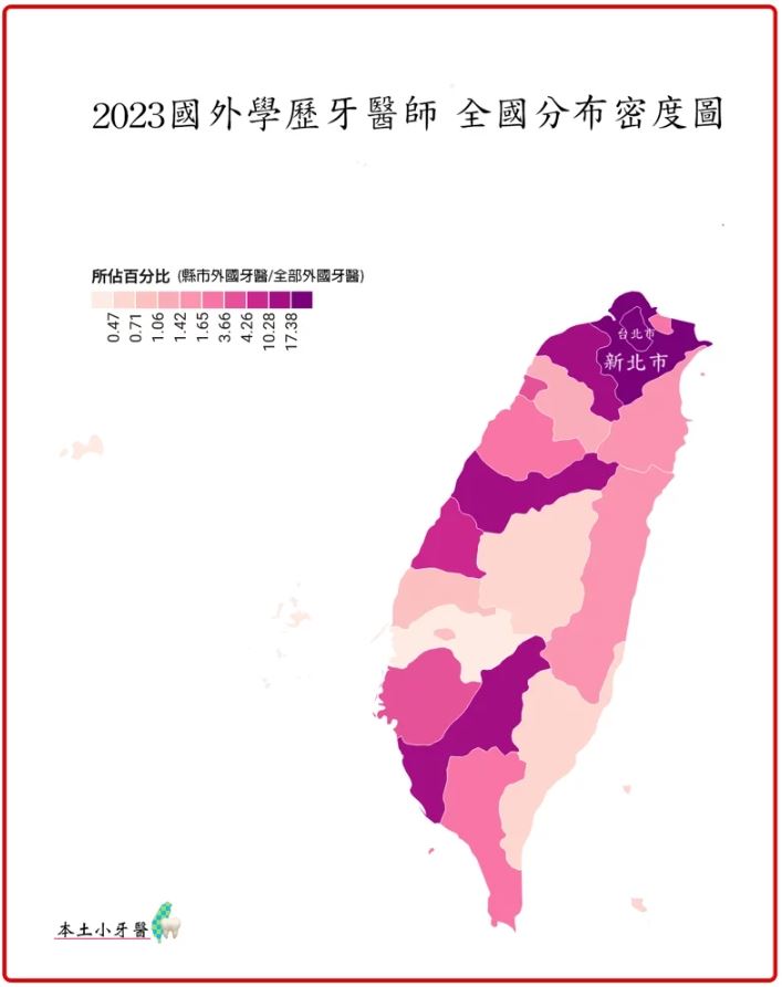 2023國外學歷牙醫師全國分布密度圖。圖/本土小牙醫聯盟提供