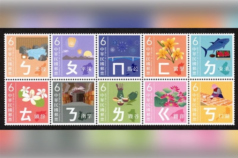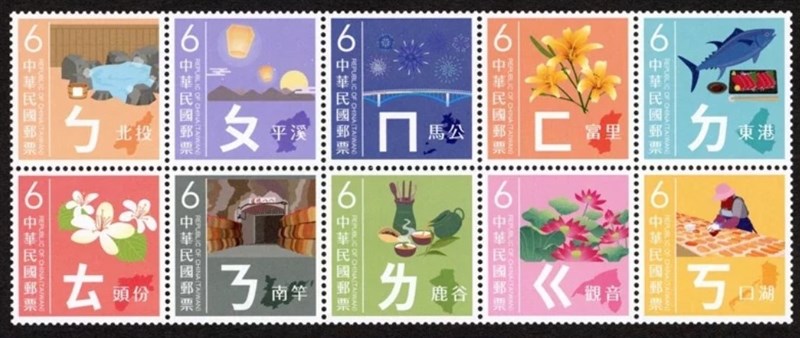中華郵政公司將於20日發行首套注音符號主題郵票,一套10枚,介紹台灣10處地名及特色。圖/中華郵政提供