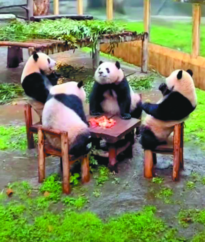 【本報綜合報導】中國大陸重慶一處大貓熊基地有四隻大貓熊圍坐一桌,彷彿下一刻要打麻將,場面十分喜感,飼養員解釋:「牠們喜歡坐一起。」在網路瘋傳的影片裡可見到,四隻貓熊圍在小方桌旁,坐在椅子上吃著蘋果,無憂無慮的模樣相當悠哉,看起來就像是喝著下午茶一邊打麻將的老太太、老伯伯。網友們看到這一幕也留言直呼:「太可愛了,真的像在打麻將。」