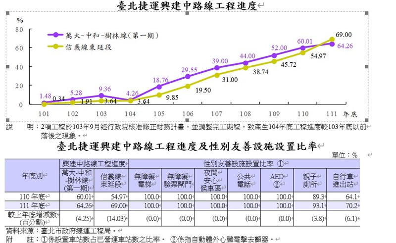 主計處指出,這2項工程目前均達預定進度。至於萬大線第二期、環狀線北環段及南環段2項工程則尚處發包施工階段。