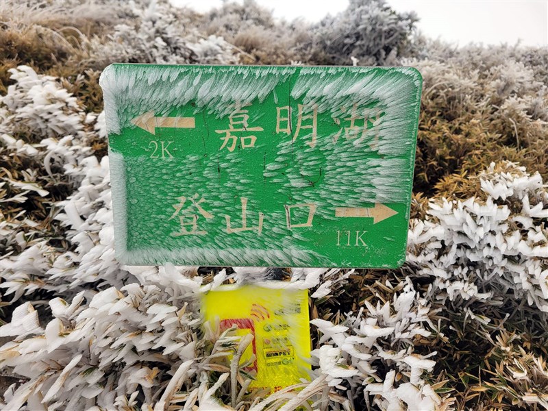 因山區氣溫仍然很低,霧淞覆蓋箭竹林,山頭一片雪白,上山要多準備禦寒衣物。
