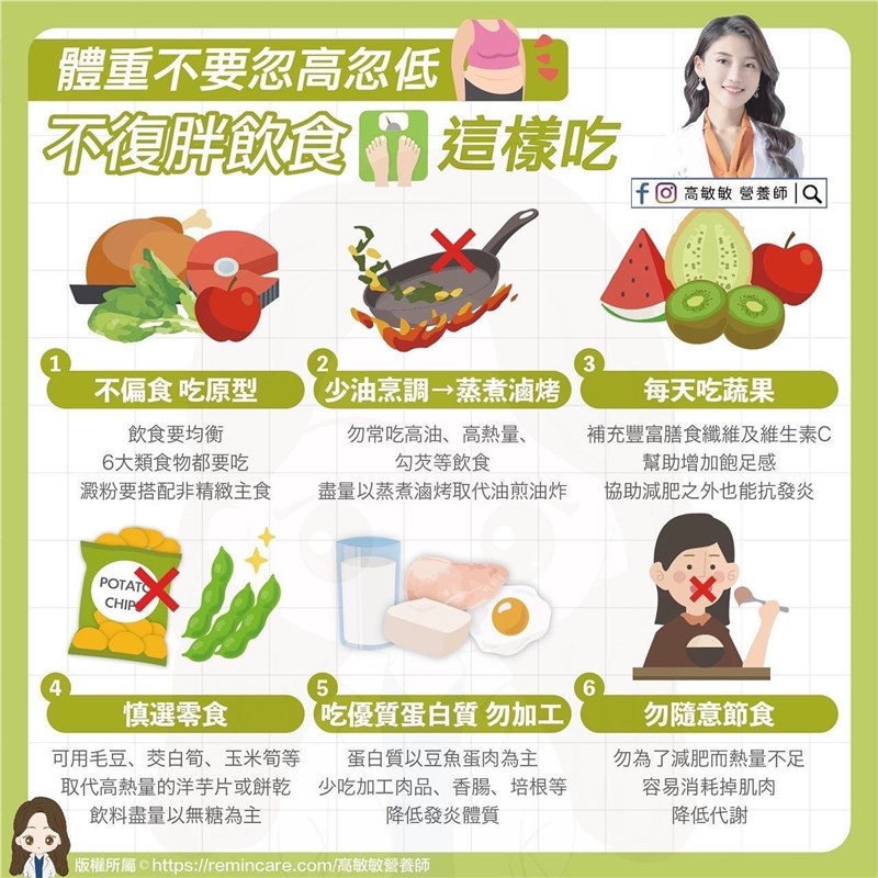 減肥成功後怎麼吃 「不復胖」飲食看這裡 陳玲芳 |2023.03.15 語音朗讀 2623觀看次 字級 大 中 小 營養師提醒,減肥成功後最怕「復胖」,要維持成果,須遵守不復胖飲食原則。圖/pexels 【記者陳玲芳台北報導】減肥,減得太快,營養專家們可不會給你拍拍手;因為,減肥比的是「瘦得久」,而非「瘦得快」。否則,每一次的「復胖」,都可能會讓你比原來更胖、體脂肪變更高。營養師高敏敏提醒,減肥者最怕的是讓「復胖」的溜溜球效應,一再發生。而想要「不復胖」,避免體重忽高忽低,就要落實以下6大飲食原則:不復胖飲食 營養師教6招 1.不偏食 吃原型食物飲食要均衡,6大類食物都要吃,澱粉要搭配非精緻主食,可選擇黑米、糙米、燕麥等,或是用原型全穀食物,如玉米、蕃薯、馬鈴薯、芋頭,取代部分白飯、白麵條。2.少油烹調 蒸煮滷烤不想吃進過多熱量,烹調方式很重要。高敏敏提醒,高油、高熱量、勾芡等飲食勿常吃,應盡量以蒸、煮、滷、烤方式,取代油煎、油炸,並多搭配不同蔬菜。3.每天吃蔬果蔬菜以各色蔬菜類、菇類、藻類為主,其中富含膳食纖維,可幫助順暢排便。水果每天吃2拳頭或放到碗裡約8分滿碗的量。補充豐富膳食纖維及維生素C,可幫助增加飽足感,有利維持減肥成效之外,也能抗發炎。圖/Unsplash4. 慎選零食想吃零食時,不要太壓抑自己,只要吃的是健康零嘴就沒關係。建議可用毛豆、黑豆、茭白筍、玉米筍、大番茄等,取代高熱量的洋芋片或餅乾;也可以來盤水果、喝杯豆漿或牛奶、優酪乳,而飲料則盡量以「無糖」為主。5.吃優質蛋白質 少吃加工食品即便是減重時期,蛋白質的攝取也不能少!因為足夠的蛋白質,才可以維持肌肉量、生理機能、基礎代謝率。如何選擇?建議優先選擇植物性飲食,補充順序以豆、魚、蛋、肉為主。少吃加工食品,如香腸、培根等,以降低發炎體質。6. 不隨意節食其實,在控制熱量卡路里時,最擔心的就是「吃太少,常常感到肚子餓」。的確,控制飲食是控制「體態」很重要的環節,但是,「不吃」不等於會「變瘦」,有時反而還可能變胖。圖/pexels「人體肌肉是很珍貴的啊!」高敏敏提醒,切勿為了減肥而熱量不足,容易消耗肌肉、降低代謝。還有,也不要等餓了才吃飯。 按時、定量攝取,維持餐餐均衡、不過飽,才是較好的飲食習慣。除此之外,也提醒大家,可以多吃蔬菜、低卡原型食物,而不要放縱自己吃「空熱量」食物,像是炸物、加工食品、甜點等。高敏敏表示,減重並非一天、兩天就能完成的事,減肥成功固然值得高興,但若要避免「前功盡棄」,就要打破「瘦得快」的迷思,朝持之以恆、「瘦得久」的方向努力。畢竟,健康是一輩子的事,唯有慢慢地貫徹到日常生活中,才是長久之計。圖/高敏敏營養師提供 前一篇文章 【簡訊】 下一篇文章 壓力山大變憂鬱 社會支持降風險 熱門新聞 01【讓愛自由】纏繞與獨立之間2026.04.0202新生首次到校2026.04.0203星雲大師靈骨分燈泰國 化益世人2026.04.0204打字機重返課堂 對抗AI代寫2026.04.0205租賃車業者違法攬客 觀光署:最高罰200萬元2026.04.0706緬甸佛學院訪佛光山 深化教育弘法發展2026.04.0207日月潭蓄水率 跌破6成2026.04.0208睡足多運動常吃蔬菜 改善生活習慣促健康2026.04.0209徐若熙日職初登板 6局6K奪首勝2026.04.0210奧斯陸佛光童軍 體驗禪修學滑雪2026.04.02 訂閱電子報 台北市 天氣預報 台灣一週天氣預報 相關報導 守護孩子聲命 純音聽力檢查是關鍵清晨運動增加強度 交叉鍛鍊延年益壽焦躁易怒火氣大 跟攝取油脂有關清明養生疏肝解鬱 玫瑰花茶調肝降火認識青春痘成因 正確抗痘避免留疤睡足多運動常吃蔬菜 改善生活習慣促健康 作者其他文章守護孩子聲命 純音聽力檢查是關鍵清明養生疏肝解鬱 玫瑰花茶調肝降火6神穴舒筋止痛 中醫養生兼抗老助眠把握遠視儲備期 防兒童近視惡化齒列矯正冒黑縫 黑三角真相跨國醫療 男童重拾笑容開心跑跳