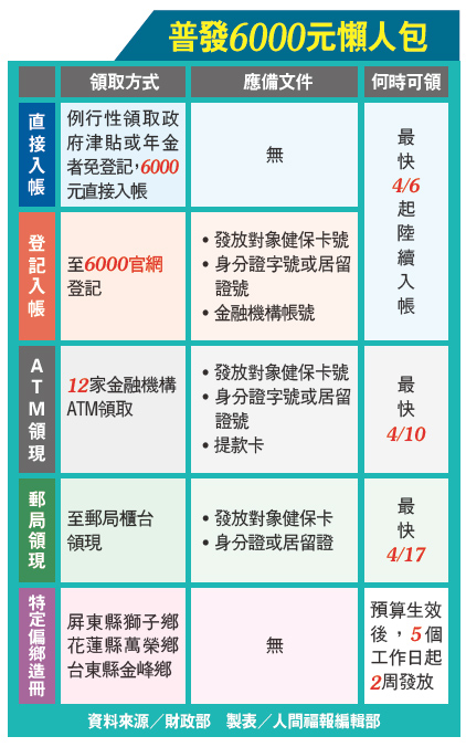 【本報台北訊】財政部昨天公布全民普發現金6000元的5種方式,包括登記入帳、ATM領現、郵局領現、直接入帳,以及偏鄉造冊發放。數位部也公布登記入帳官網,3月22日起開放民眾上網預先登記,前5日採身分證字號尾數分流,28日起可查詢登記結果,登記系統至少開放半年。