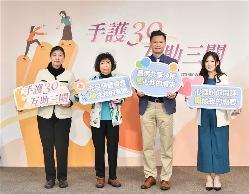 左起為類風溼性關節炎病友陳小姐、中華民國類風濕性關節炎之友協會理事長包素娟、三總內科部風溼免疫過敏科主治醫師盧俊吉、林口長庚風溼過敏科主治醫師蔡昀臻,同台鼓勵青壯年患者遵從醫囑、積極治療。圖/記者陳玲芳