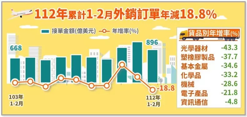 2月外銷訂單421.2億美元 年減18.3%連六黑 |2023.03.20 語音朗讀 1502觀看次 字級 大 中 小 2月外銷訂單表現,訂單金額為421.2億美元,年減18.3%,陷入「連六黑」。圖/資料照片 【本報台北訊】經濟部統計處今(20)日公布2月外銷訂單表現,訂單金額為421.2億美元,年減18.3%,陷入「連六黑」。排除季節因素,1、2月合計為896.3億美元,仍年減18.8%。圖/經濟部統計處統計處預估,3月外銷訂單金額為480億美元至500億美元,年減23.4%至年減20.2%,恐陷入「連七黑」。統計處預估,第1季1376億美元至1396億美元,年減20.5%至年減19.3%。 前一篇文章 曾考慮進軍職棒 合庫目標擺在為國舉才 下一篇文章 科大四年制申請入學 20日至23日報名 熱門新聞 01台中新社花海 重現經典卡通2025.11.0602WTA、ATP年終賽 獎金創新高2025.11.0703大崗山淨山健走行三好 佛光人守護山林2025.11.0504法水寺送給天國的信 700天燈傳達想念祝福2025.11.0505佛光山中區三皈五戒 佛子安頓身心2025.11.0506星雲大師全集【傳記】百年佛緣─生活篇 我的衣食住行 5 - 32025.11.0507【快樂塗鴉簿】夢境旅遊2025.11.0508【古堡麗影】倫敦塔:英國千年歷史活教材2025.11.0509山本由伸 拚美職首座賽揚獎2025.11.0510古老金幣2025.11.05 訂閱電子報 台北市 天氣預報 台灣一週天氣預報 相關報導 台近7成員工薪資 低於平均訪歐返台 蕭美琴:處境艱難不退縮魏哲家:黃仁勳來要更多晶片興達電廠 應變演練澎湖馬祖包機 空中交通創舉中興新村活化 省主席官邸變身餐廳
