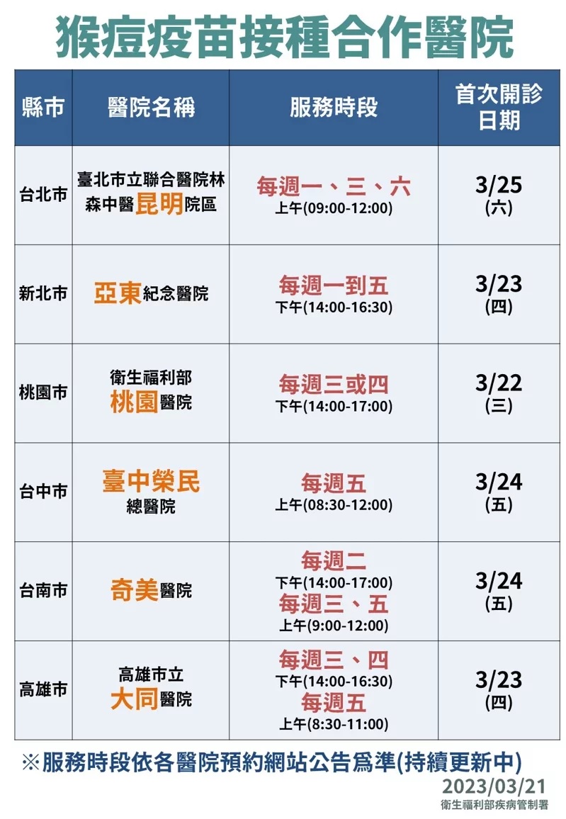 猴痘疫苗於六都各設一家醫院提供接種,別為台北市立聯合醫院林森中醫昆明院區、亞東紀念醫院、衛生福利部桃園醫院、台中榮民總醫院、奇美醫院、高雄市立大同醫院。