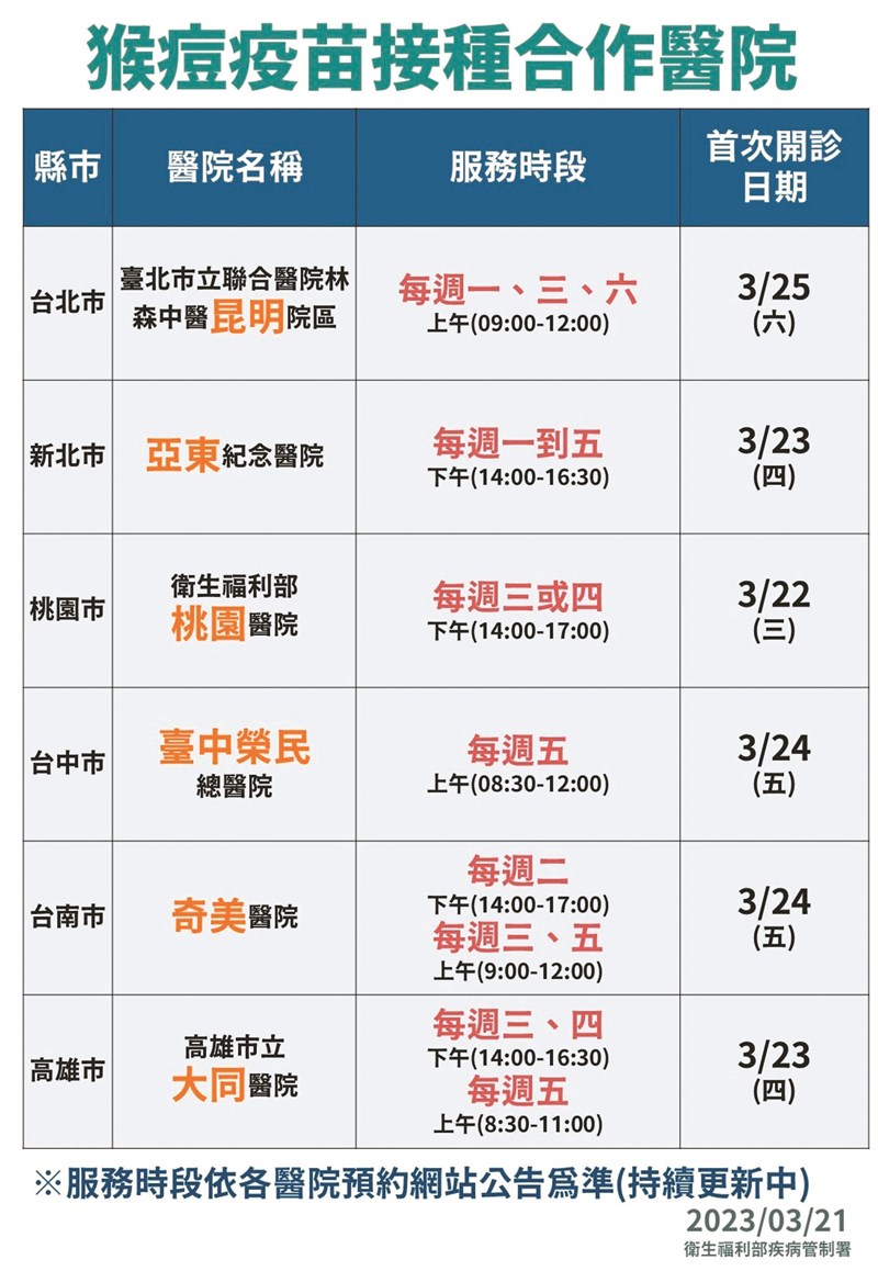 猴痘疫苗於六都各設一家醫院提供接種,別為台北市立聯合醫院林森中醫昆明院區、亞東紀念醫院、衛生福利部桃園醫院、台中榮民總醫院、奇美醫院、高雄市立大同醫院。