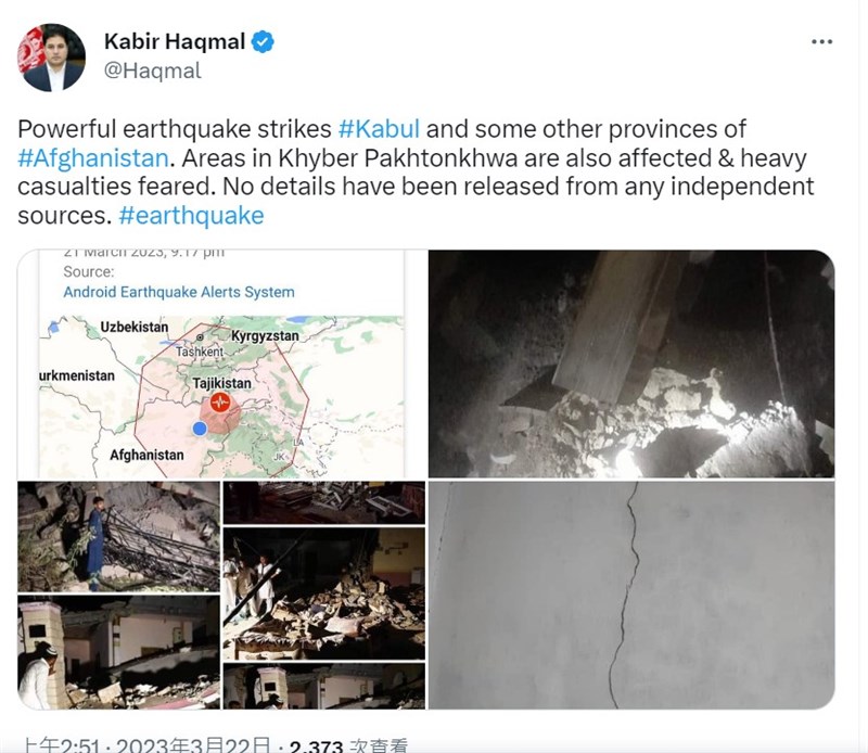 根據歐洲地中海地震中心(EMSC)和美國地質調查所(USGS)資訊顯示,阿富汗北部遭到規模6.5強烈地震襲擊,阿富汗全境和鄰國巴基斯坦北部都感受得到搖撼,強震持續至少30秒,居民驚慌從家中逃出。