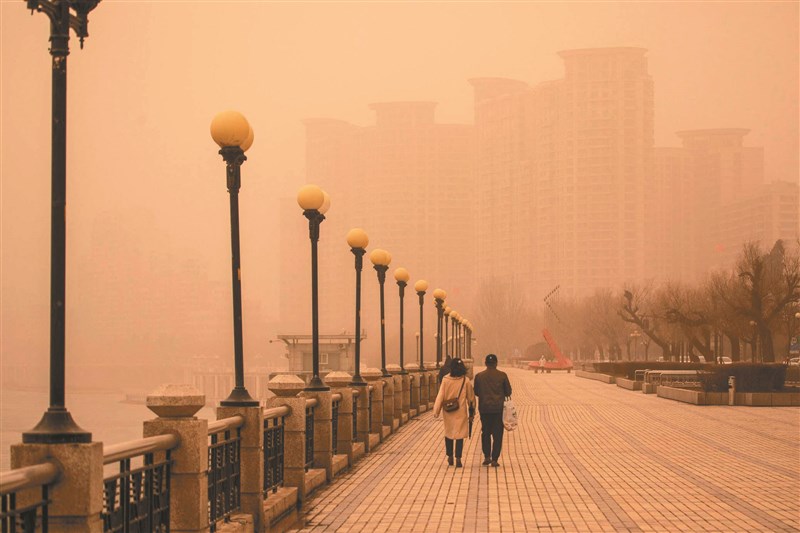【本報綜合報導】中國大陸北方吹起2023年以來最嚴重的沙塵暴。新華社報導,21日到22日晨,大陸北方多地出現揚沙或浮塵天氣,內蒙古中東部、河北西北部、及北京等地出現沙塵暴,局地PM10超過2000微克/立方米,能見度明顯降低,空氣中塵土瀰漫。北京已達嚴重汙染程度,天空霧濛濛,高樓層房屋籠罩黃沙,地面汽車車頂一層沙,民眾都戴起口罩,低頭走路。