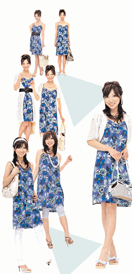 洋溢著夏日氣息的藍紫碎花細肩帶洋裝,可以簡單輕鬆,也可以嫵媚多姿,只要更換髮型與配件,立刻換了一個模樣,像有魔法一樣,一件洋裝,七種穿法,多種風情