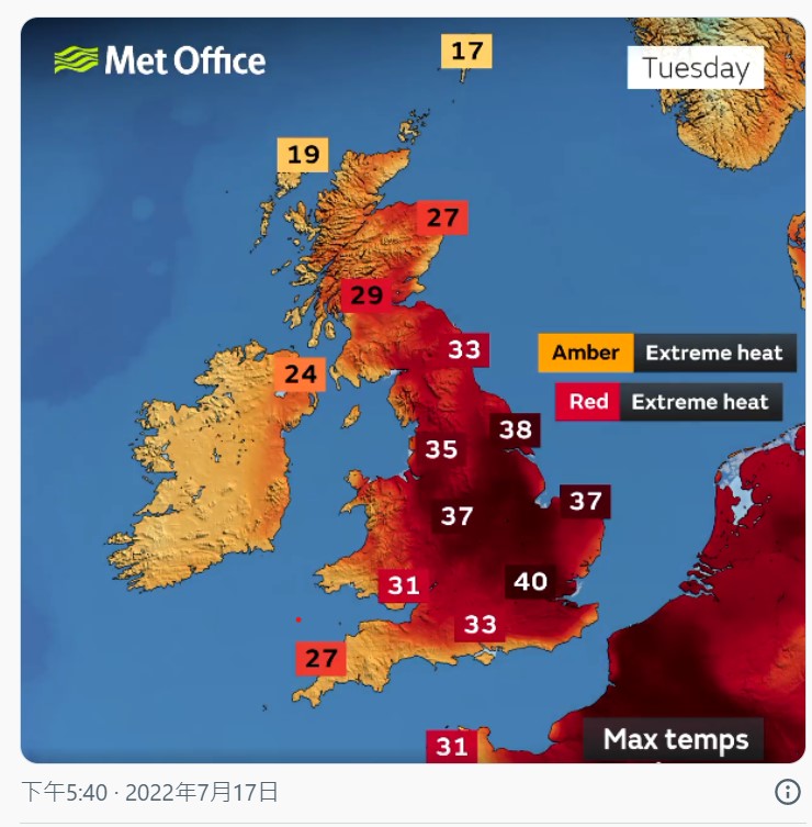 歐洲各地高溫圖。圖/twitter@Aidan McGivern