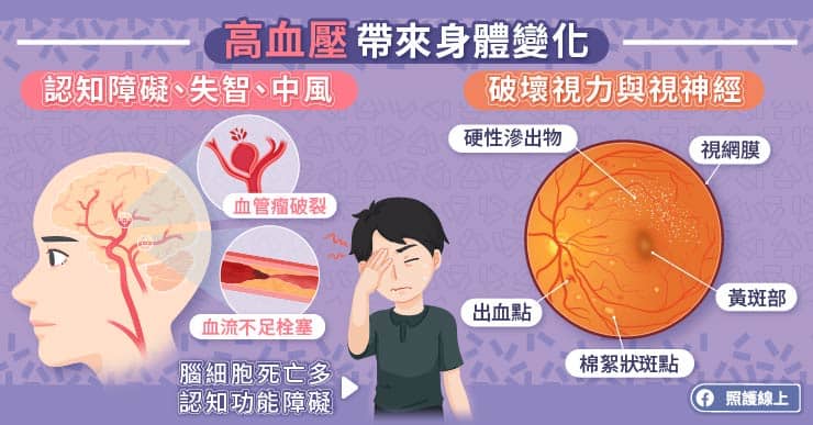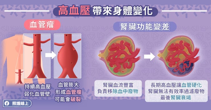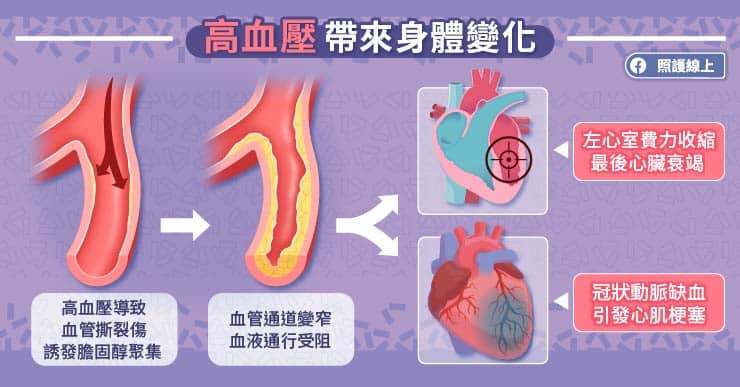 血壓走高 究竟會讓身體出現什麼變化 |2023.03.26 語音朗讀 1086觀看次 字級 大 中 小 高血壓初期常常沒有症狀,讓人不會特別去注意,但仍要常關心血壓,畢竟長期失控的血壓會導致身體多重器官受損。示意圖/unsplash 【本報台北訊】首先我們先來認識一下血壓。血壓代表著血液流動時,血管所承受的壓力。大家看到血壓的數值會有兩個,例如127/83毫米汞柱這樣的紀錄法。前面那個數字代表「收縮壓」,後一個數字是「舒張壓」。「收縮壓」代表心臟收縮時血管承受的壓力;「舒張壓」代表心臟放鬆時血管承受的壓力;因為心臟收縮的時候血管會承受高一點的壓力,因此收縮壓會高於舒張壓。在127/83毫米汞柱這樣的紀錄法下,我們可知收縮壓為127毫米汞柱,舒張壓為83毫米汞柱。常健康成人的血壓應該是120/80毫米汞柱以內,平常應該要定期測量自己的血壓,因為當高血壓的時候,通常不會有什麼症狀。可是,長期的高血壓會帶來許多身體危害,因為這代表著血液在血管裡流動的時候,力道是過強的,不斷衝擊著血管管壁,血管就會愈來愈不健康。一個人患有高血壓的時間愈久,無論是不知情,或是不想理,總之當從來沒有控制血壓,就會愈危險,帶來愈多的併發症。接下來我們就來看看高血壓帶來的身體危害。●血流不足缺血原本我們的血管應該是強壯並具有彈性的。然而當血壓大的時候,血管壁持續受到愈高的壓力衝擊,血管壁可能出現微小的撕裂傷,而這些撕裂傷容易引起膽固醇的聚集,當愈來愈多膽固醇卡在血管,血管的通道就變窄,讓血液通行受阻。血管被卡住的地方愈多,血液愈難無法進入到組織或器官。若這件事情發生在供應心臟的冠狀動脈,會引發心絞痛、心律不整,這就是一般我們講到的「心肌梗塞」,指冠狀動脈被阻塞了,於是血流無法進入到心臟肌肉,心臟肌肉無法收縮做工。全身上下有許多大大小小的血管,在高血壓的時候,不是只有心臟的血管會被破壞,全身到處的血管都可能被破壞到。像是負責性器官的血管出現阻塞,患者就會有男性功能障礙。●心臟衰竭血壓高,造成血管壁微小撕裂傷,導致膽固醇聚集阻塞,血管通道變窄,血液行受阻。血液通行受阻的時候,很難將血液送往各個組織與器官,心臟可能就會更費力地工作,不過效率依舊不好,左心室得要賣了老命地用力收縮,想再把血打出去一些,左心室工作這麼累,時間一久就會心臟衰竭,患者很容易喘、容易累,還有水腫情形。●血管瘤血管持續被高血壓衝擊的時候,血管壁變得弱化,可能就膨出變成一個血管瘤,就像是被撐出一小包氣球的樣貌。當然,這樣的血管瘤本身來說就是個不夠強健的組織,因此當持續的高血壓繼續衝擊著血管壁,會讓血管瘤愈來愈大,有朝一日甚至因為撐得血管壁太薄、撐得太大而破裂,造成致命的內出血問題。血管瘤的狀況可能出現在身體各處,例如腦部的血管瘤破裂時,會讓人頭部劇烈疼痛,失去意識;在身體腹部的主動脈瘤,則可能讓人摸到一個有脈搏跳動的腫塊,萬一破裂,同樣會造成腹部劇痛並很可能奪人性命。●腎臟功能變差我們一直說到,高血壓會造成的問題是讓血管承受過高的壓力,導致血管愈來愈不健康,因此血管密集的區域一定會遭受高血壓帶來的破壞,而腎臟就是一個血流豐富的區域,很容易受到高血壓的影響。腎臟的功能是移除血液中的廢物、調解血量與壓力,製做尿液將廢物排出體外;為了達成這麼繁重的任務,腎臟裡面有密集的小型血管負責各樣工作,於是血壓高會讓負責過濾廢物的血管硬化、受傷,腎臟無法有效率地過濾廢物,工作更形艱困,最後會讓腎臟失能衰竭,喪失過濾廢物的能力。●認知障礙、失智、中風高血壓久了,血管不夠健康,腦部獲取到的血流變少,腦細胞沒法獲取到足量的氧氣、養分,腦細胞死亡速度變快,導致讓人的專注力下降、記憶力變差、很難好好思考,認知功能出現障礙,更嚴重一些會到血管型失智的程度。所以啦,請記得,血管要顧好,腦部才會健康。假使是動脈粥狀硬化嚴重,血流直接被阻斷,患者有更多腦部功能區失能,就是平常我們說的「腦中風(梗塞型)」;萬一是高血壓導致了腦血管瘤破裂,則會出現出血性的腦中風。無論哪一種,腦部功能都會下降,即使沒有喪命,可能還是會帶來認知障礙及失智的長期問題。●破壞視力與視神經眼睛構造內有許多細緻精密的血管。眼睛後方的視網膜區負責感光,當這附近的血管因高血壓受損,可能會造成視網膜出血,患者視力變得模糊,甚至完全看不到。而高血壓也會影響供應視神經的血管,讓患者視力變得更差。別等高血壓造成症狀高血壓的初期常常沒有症狀,讓人不會特別去注意。然而我們還是要盡量好好控制血壓,畢竟長期失控的血壓會導致身體多重器官受損,最後容易死在相關併發症。想要避免這些併發症,還是要早早從飲食、運動、和藥物做起,並定期測量血壓,了解自己的身體狀況。本文由「照護線上https://www.careonline.com.tw/」授權轉載。原文出處:https://www.careonline.com.tw/2023/03/physical-change-in-hypertension.html原文標題:血壓高,究竟會讓身體出現什麼變化?圖解懶人包 前一篇文章 咳嗽逾2周 恐染結核病 下一篇文章 女性更年期6症狀 壓力控管助改善 熱門新聞 01【詩】很遠的那邊2025.11.2402【歲時.節氣】小雪──霜風一夜落寒林2025.11.2003菲三好校園10年有成 399校倡和諧2025.11.2104佛大蔬食系 國際