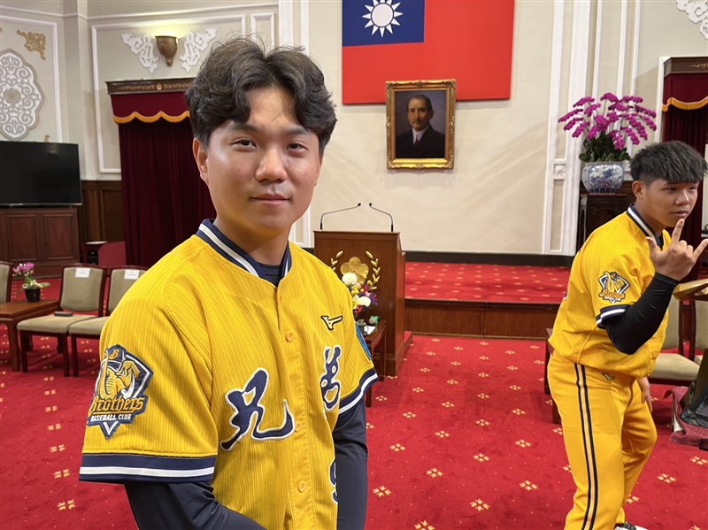 總統在致詞時提到兄弟陣中多名入選世界棒球經典賽中華隊陣容的球員,談到江坤宇時,總統先說:「小可愛,誰啊?」隨後江坤宇就主動起身。