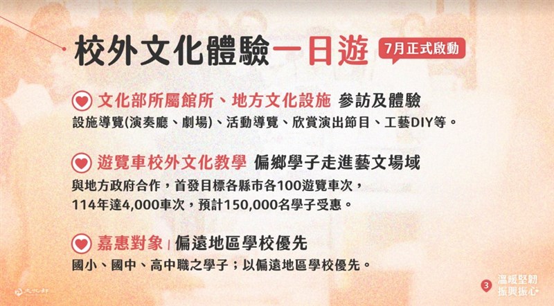 而為讓高中職、國中及國小學生有更多的文化體驗機會,文化部7月起將與地方政府合作辦理「校外文化體驗一日遊」,以偏鄉地區學生為優先,鼓勵學校帶領學生到文化部所屬館所或鄰近地方文化設施、場域等參訪,並搭配導覽、節目欣賞、體驗等活動。預計至2025年達成各縣市至少100車次,全國合計4000車次、15萬人次目標,讓學生「走出教室、走進藝文場域」。