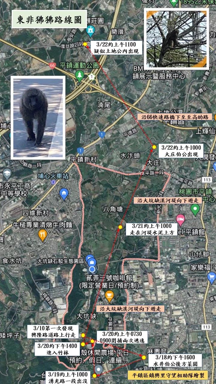 狒狒逃亡16天抓到了! 圍捕受傷急救無效 |2023.03.27 語音朗讀 19879觀看次 字級 大 中 小 27日下午,市府農業局抓狒戰情室人員持續在台鐵富岡機廠基地外圍逐漸縮小範圍,農業局人員下午3時多,將狒狒「逮捕歸案」,最終將送台北市立動物園安置。圖/陳正興 【本報桃園訊】桃園狒狒奔逃至今已16天,市府農業局抓狒戰情室人員今(27)日下午持續在台鐵富岡機廠基地外圍逐漸縮小範圍,農業局人員下午3時多,將狒狒「逮捕歸案」,但狒狒在圍捕過程中受傷,因傷勢嚴重,急救無效已經死亡。桃園市農業局表示,當時到現場時狒狒已經受傷,經查是遭到獵槍打中,因桃園市府參與人員僅配置麻醉槍,且無委託外部人員加入,農業局將報警釐清相關狀況。桃園狒狒南桃園奔逃,市府農業局今(27)日上午傳出現身台鐵富岡機廠,還在基地內大搖大擺閒晃,結果下午傳出狒狒已經被抓到。當時農業局看見立即扣下板機朝牠發射麻醉槍,擊中後順利將牠逮捕。據了解,原打算將狒狒載往六福村,並送至台北市立動物園安置,不幸在圍捕過程中受傷,急救無效。3月27日,桃園市政府農業局出動空拍機追蹤狒狒。圖/桃園市農業局提供脫逃狒狒奔逃路線曾跑至平鎮、新屋至楊梅區四處閃躲,未傳出攻擊人事件,農業局人員於今(27)日下午將狒狒「逮捕歸案」。20日上午桃園市驚見狒狒在街上出沒,一路從平鎮往新屋移動,地方人心惶惶擔心遭攻擊,更傳出狒狒是從六福村野生動物園脫逃,但六福村表示,園內狒狒有短少。3月初有東非狒狒脫逃至桃園市平鎮區,23日被民眾目擊。圖/取自臉書社團「路上觀察學院」桃園平鎮鎮興里長黃志杰指出,3月10日就有里內工廠發現狒狒蹤跡,狒狒在當地已停留12天,他20日通知六福村協助,與守望相助隊和獸醫等10多人連3天搜捕,雖2度圍捕狒狒,還是被脫逃。桃園平鎮區里長繪製狒狒逃脫路線呼籲民眾小心。圖/取自黃志杰臉書26日楊梅區員富岡員本里彭姓農民表示,狒狒25日經過他的菜園,偷吃幾顆萵苣(大陸妹),並在菜園留下疑似足跡。農業局人員研判這隻狒狒喜愛逗留菜園周邊,找尋香蕉或芭蕉、甘蔗及萵苣等蔬果覓食。桃園脫逃狒狒25日侵入菜園偷吃萵苣,留下足跡,農業局人員查證搜捕。圖/市府農業局提供狒狒逃亡在外已經16天,今(27)日一早民眾發現狒狒跑到台鐵富岡機廠,在機房中看起來老神在在逛大街,對此桃園農業局今掌握出沒熱區在楊梅、富岡地區,出動空拍機搜尋,並利用誘捕方式全力搜捕。市府農業局抓狒戰情室人員下午3時多,終於順利將狒狒「逮捕歸案」。27日狒狒現蹤於台鐵富岡機廠附近。圖/取自臉書「湯瑪士的日常」 前一篇文章 文化部:成年禮金6/6領取 「文化體驗一日遊」7月啟動 下一篇文章 台北時裝周揭曉4潛力新秀 實踐大學榮獲最佳展演學校 熱門新聞 01法華禪寺深化宗教交流 拜會斯里蘭卡駐法大使2026.01.1602告急! 全台血庫剩5.3天 O型最缺2026.01.1603全球共讀《傳燈錄》 人間佛教雲端點燈2026.01.1604【生活快門】環保地球儀2026.01.1605【時光重逢】心裡有荷‧李蕭錕書畫照見初心2026.01.1606安心過年 海天佛剎送暖福田戶2026.01.1607大腦發炎易引發焦慮 吃莓果橄欖油助修復2026.01.1608舞獅躍動 馬德里佛青展現所學2026.01.1609【翻轉人生】修好機車 修好人生2026.01.1610【女子生活學】月亮忘記了2026.01.16 訂閱電子報 台北市 天氣預報 台灣一週天氣預報 相關報導 汽車與農產品 美要求開放市場台美關稅談判 鄭麗君今說明周折汪喵嘉年華 總統籲零棄養高雄新材料循環產業園區台半導體供應鏈 4成移美歷來最大手筆 台積今年資本支出 將逾500億美元