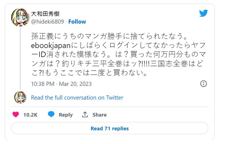 數位焚書 日本漫畫家藏書 「全沒了」 |2023.03.27 語音朗讀 930觀看次 字級 大 中 小 看漫畫示意圖。圖/資料照片 【本報綜合外電報導】日本漫畫家大和田秀樹以《鋼彈》作品聞名,日前他因太久沒有登入電子書平台eBookJapan導致帳號被系統自動刪除,他花了幾萬日圓收藏的漫畫一夕間全沒了。有網友戲稱,這是數位焚書嗎?大和田秀樹20日透過推特抱怨,表示由於自己太久沒登入eBookJapn電子書平台,未料帳號被砍掉,「我花了幾萬日元買的漫畫呢?《天才小釣手》、《三國志》全集跑哪裡去了?」eBookJapan隸屬於日本Yahoo旗下平台,大和田秀樹便氣到一起痛罵日本Yahoo的老闆「孫正義」怎麼可以隨便丟掉別人買的漫畫,後來大和田秀樹也展示了自己先前購買的 ebookjapan 電子書閱讀器照片,繼續說:「我很喜歡 ebookjapan 閱讀器的介面,能看的出來是由喜愛漫畫的人所打造。但現在我只要點擊就會顯示錯誤,真的很讓人想哭」圖/取自玩具人網站大和田秀樹再度更新推文,他展示出自己的eBookJapan閱讀器,並提到能感覺得出來該平台是由喜愛漫畫的人打造出來的,但現在因為帳號被刪除,只要點擊進入平台就會顯示錯誤訊息,讓他感到相當錯愕難過。許多粉絲得知大和田秀樹的平台帳號遭刪的悲劇後,紛紛留言安慰「這就是購買電子書的風險⋯⋯」、「即使選擇開放下載的平台,但如果有DRM(數位版權管理)的話,每次開啟檔案都必須連結到指定平台,因此即便下載了也無法避免書籍完全消失」,也有人找出yahoo公告寫著「我們將停止2年未使用的帳號並透過電子郵件提醒用戶⋯⋯」,但粉絲們對這項公告更加不滿,認為yahoo不應刪除用戶花錢購買的資產。還有人替大和田秀樹打抱不平,留言狠酸Yahoo平台「即便我使用的是付費版的Yahoo Premium,我的帳號也會被刪除嗎?」、「這是不對的吧?從法律上來說,單方面限制對方的權利是不公平的」、「我很害怕,畢竟我在eBookJapan上有好幾千本書」。圖/Twitter@hideki6809後來也有網友回應,日本的 Yahoo ID 只要 2 年不登入的話,不管是否有消費都會被刪除,還開玩笑的說:「這是數位焚書功能」「我也在 ebookjapan 買了上千本書,所以很害怕」「即使把這些漫畫下載回來,要閱讀時還是要連接網路才能觀看,所以下載根本無法避免」「重要的東西還是只能以實物為主吧」 前一篇文章 夏令時間爭議 黎巴嫩有兩個時區 下一篇文章 馬英九抵上海 兩岸分治後首名卸任總統登陸 熱門新聞 01MLB太空人打敗洛磯 鄧愷威中繼成功2026.04.1602法全票通過 掠奪文物歸還中國2026.04.1703【深深思念】把悲傷 穿在身上2026.04.1404勞動部將研議 勞退舊制移入新制2026.04.1805佛光山線上佛學院開學 逾百學員雲端共學2026.04.1506《浩瀚星雲》大阪海外首演 轟動滿座 2026.04.1407預備檀講師研習 傳播人間佛教正能量2026.04.140845%失智症可預防 類黃酮食物護大腦2026.04.1609【詩】靜寂 2026.04.1710【詩】春天的孤挺花2026.04.16 訂閱電子報 台北市 天氣預報 台灣一週天氣預報 相關報導 羅馬萬神殿將漲價 遊客搶朝聖聯合國「漢語日」 唐卡絲畫吸睛剛果總統恩圭索連任 宣誓就職緬甸特赦數千人 翁山蘇姬減刑熊本地震10周年巴基斯坦:美伊將第2輪談判