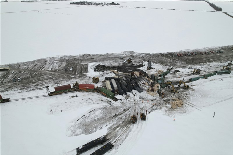 【本報綜合外電報導】一列由加拿大太平洋鐵路公司所營運的列車,於26日晚間11時15分許在美國北達科他州溫德米爾(Wyndmere)郊外出軌,70節車廂中共有31節脫軌,並發生危險物質外洩事件。