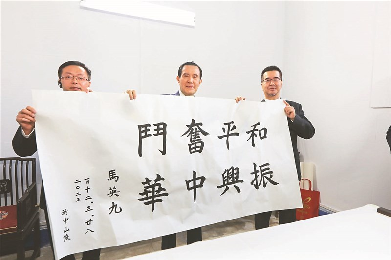 前總統馬英九(中)在南京中山陵內書寫「和平奮鬥、振興中華」八個字,署名「馬英九」。圖/馬英九基金會提供