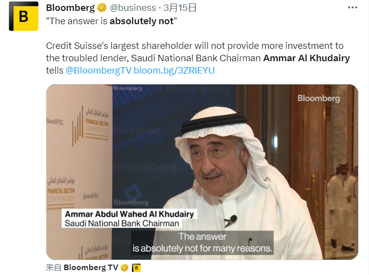 瑞信2022年增資時,SNB投入14億瑞士法郎,獲得了約9.9%的股份,成為最大股東。胡達伊里在3月15日接受彭博新聞訪問,指瑞信需要額外流動性,SNB是否願意進一步注資,胡達伊里回答一句「絕對不會」(Absolutely not)。