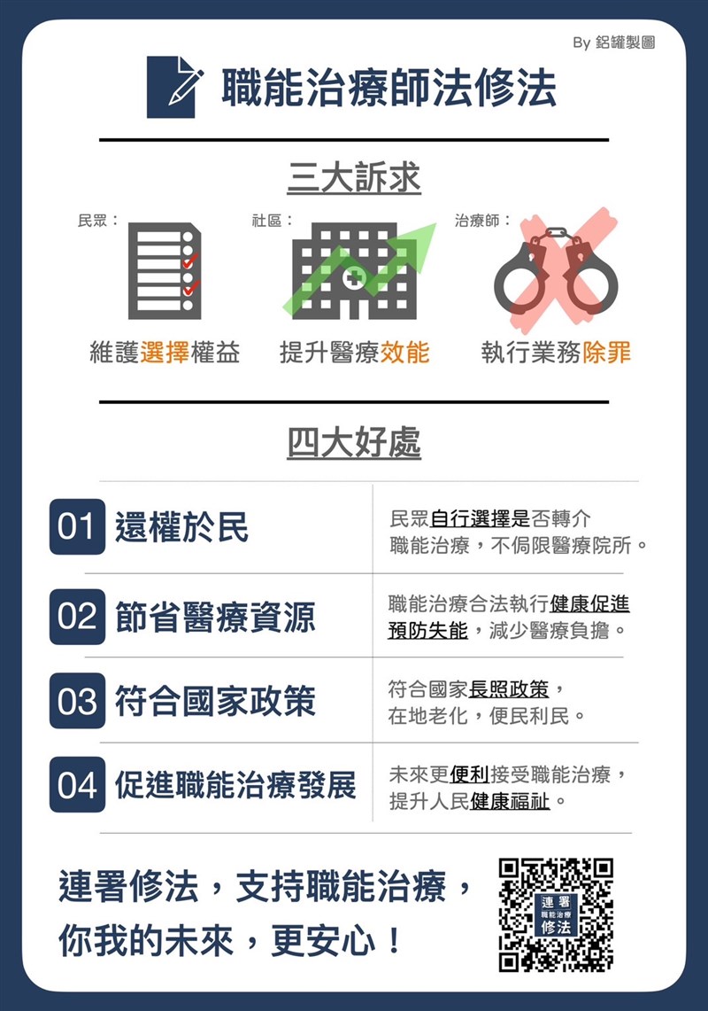 為了呼應政府一直提倡的健康促進、疾病預防,日前台灣職能治療師三個主要的組織團體「社團法人中華民國職能治療師公會全國聯合會」、「社團法人台灣職能治療學會」與「新北市職能治療師職業工會」聯合成立「職能治療師法修法聯盟」,並即刻運作,積極從多方面推廣職能治療師法修法的重要性,期能順利爭取職能治療師法修法通過。