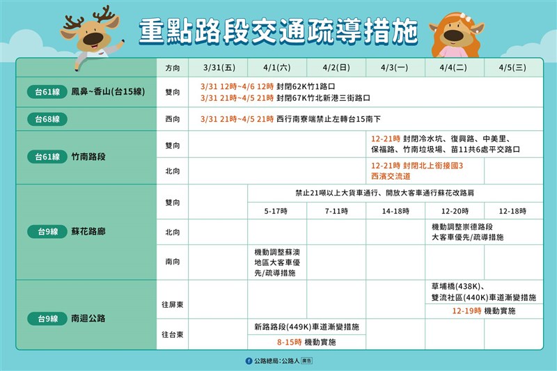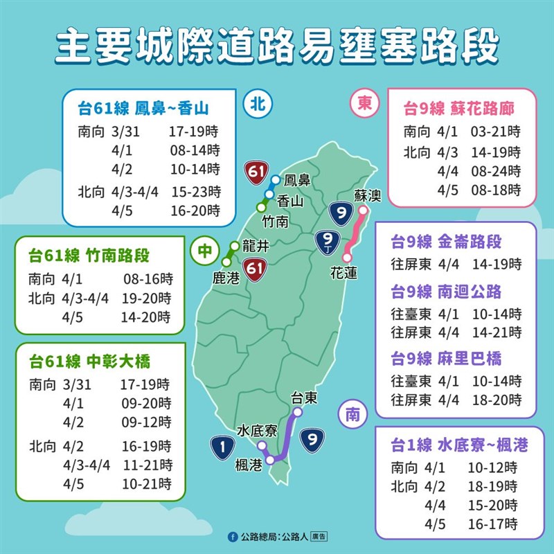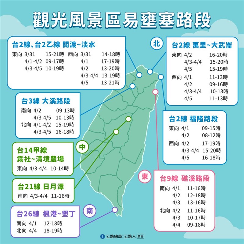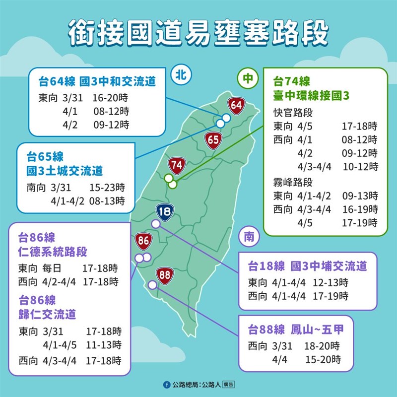 連假出門前先查詢 避開省道地雷路段 |2023.04.01 語音朗讀 926觀看次 字級 大 中 小 清明連假首日,國道3號1日湧現出遊車潮,三鶯到大溪南下路段出現塞車的情形。圖/中央社 【本報台北訊】今(1日)是清明節連假首日,交通部公路總局說,今天返鄉及出遊車潮湧現,建議用路人出發前先行查詢周邊交通狀況,以減少壅塞於車陣中的時間。省道易壅塞路段包含銜接國道快速公路(北部台65線接國3土城交流道、台64線接國3中和交流道;中部台74線台中環線接國3快官及霧峰交流道;南部台86線接國1仁德系統及接國3關廟交流道、台18線接國3中埔交流道、台88線五甲至鳳山路段)。銜接國道易壅塞路段。圖/公路總局提供主要省道幹道(台9線蘇花路廊及南迴公路、台61線鳳鼻~香山、竹南及中彰大橋路段、台1線水底寮至楓港路段)及觀光景點聯外道路(北部台2線關渡至淡水、萬里至大武崙及福隆路段、台3線大溪路段、台9線礁溪路段,中部台14甲線清境農場路段及台21線日月潭路段,南部台26線墾丁路段)。主要城際道路易壅塞路段。圖/公路總局提供公路總局說,昨天省道部分路段有車多或壅塞情形,包含北部台64線板橋至中和路段、台65線土城銜接國3及泰山銜接國1、台66線楊梅至平鎮、台9線蘇澳新火車站至箕山橋,南部台86線關廟路段、台88線鳳山銜接國5甲。清明節連假風景區車潮多,公路總局製作觀光風景區易壅塞路段圖。圖/公路總局提供為疏運民眾返鄉及外出乘車需求,公路總局說,已協調客運業者視人潮機動增班,昨天西部國道客運共計行駛7287班次,疏運13萬6844人,疏運人數較111年同期減少4.3%;東部國道客運路線共計行駛1584班次,疏運2萬9671人,疏運人數較111年同期增加2.2%。重點路段交通疏導措施。圖/公路總局提供 前一篇文章 白海豚現蹤雲林外海 海巡署記錄歷史一刻 下一篇文章 清明連假單日運量創疫後新高 桃機估逾10萬人次 熱門新聞 01男子氣概照護員 日本長照新力量2026.04.0502【無所不知】 北庭故城遺址(上)2026.04.0303【分數之外】看見另一種英文2026.04.0804租賃車業者違法攬客 觀光署:最高罰200萬元2026.04.0705【徵稿】2026.04.0306【轉移注意力】往理想中的自己邁進2026.04.0507美課藥品重稅 台灣沒優惠 2026.04.0408降雨兩樣情 南部水庫沒解渴2026.04.0609【青春部落】 那一次,我應該這樣說2026.04.0310暴雨狂炸苗栗 災情頻傳 2026.04.05 訂閱電子報 台北市 天氣預報 台灣一週天氣預報 相關報導 鄭謁中山陵 公開提中華民國鄭麗文會宋濤:兩岸非註定一戰鄭麗文今訪陸 預計4月10日晤習台澎海空疏運高峰 逾8千人提前返台海軍敦睦艦隊 進入巴拿馬運河中油高雄大林廠火警 環保局開罰