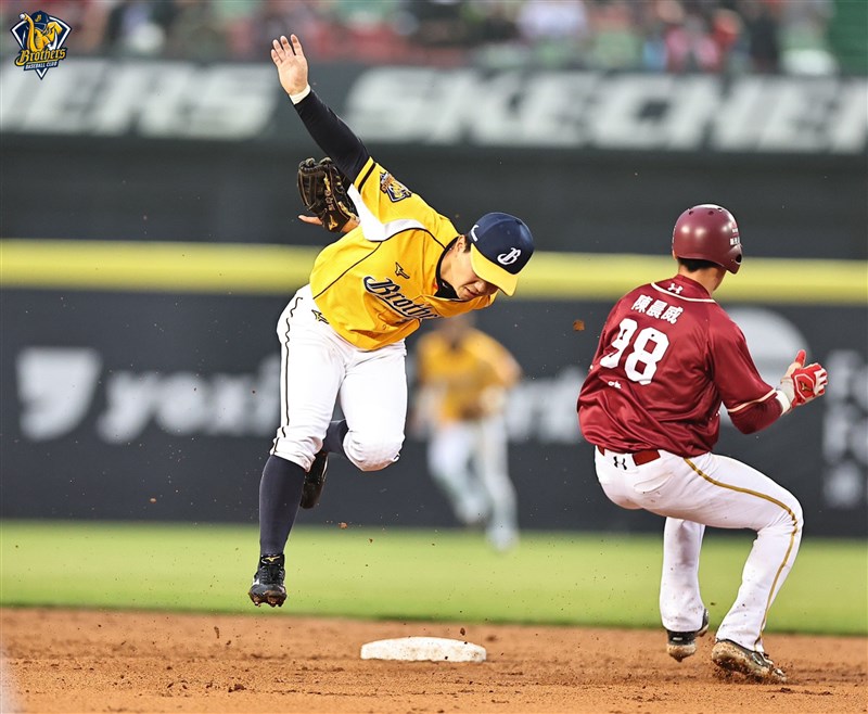 陳晨威(右)跑壘時沒有踩到二壘壘包。圖/中信兄弟提供