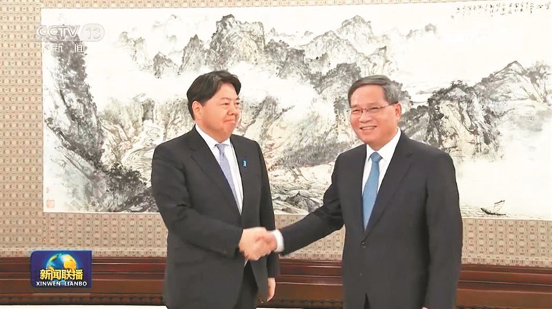 大陸國務院總理李強(右)二日會見日本外務大臣林芳正(左)。圖/取自央視