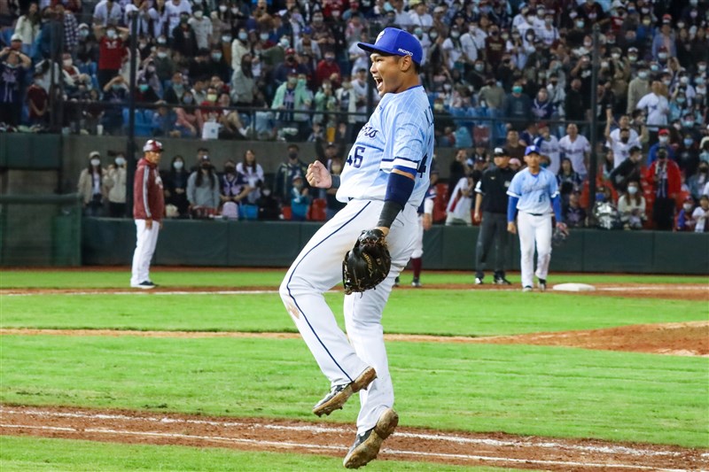 范國宸昨天抓到最後出局後興奮地在場上慶祝。圖/富邦悍將提供