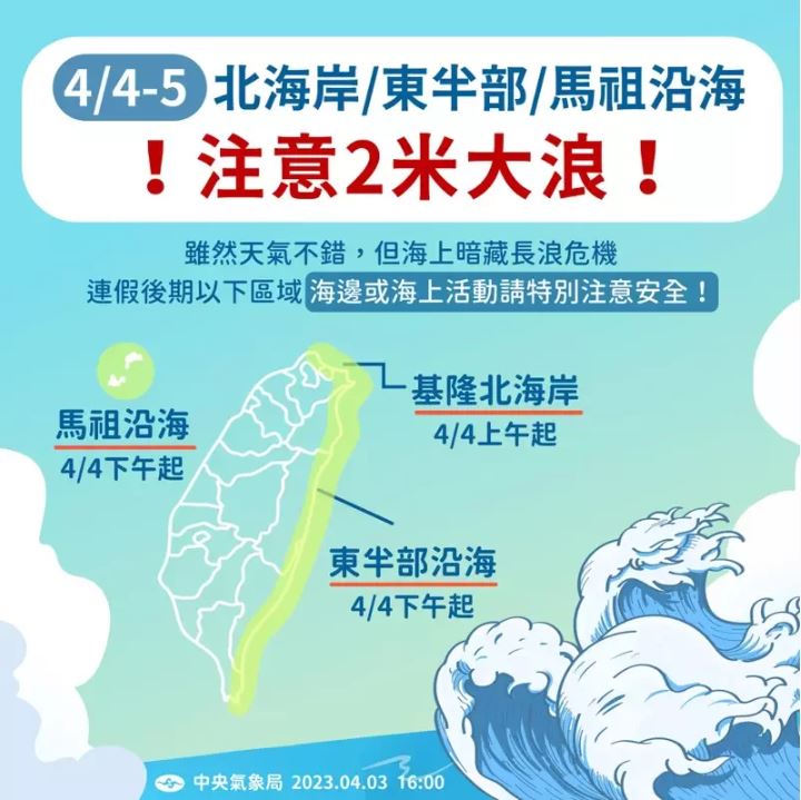 連假高溫上看30度 6日後開始降溫 |2023.04.03 語音朗讀 1565觀看次 字級 大 中 小 連假天氣好,民眾開心出遊。圖/林伯東 【本報台北訊】把握連假好天氣,中央氣象局最新預報指出,近日各地白天高溫25度至30度,南部近山區更會有32度至35度;到了收假上班日,6、7日天氣就會轉變。另外,基隆北海岸、東半部、馬祖沿海,明、後天浪高速增至2米,注意海上活動安全。中央氣象局預報員曾昭誠受訪表示,今天(3日)起到後天(5日),天氣狀況類似,各地都是晴到多雲,只有東半部,以及午後西半部山區會有些零星降雨。6日到7日,鋒面通過,東北季風增強,迎風面的中部以北、東半部,有降雨機率,降雨範圍也會較廣;南部山區也有些許降雨,但量不多,南部平地主要以陰天多雲為主。8日東北季風影響,水氣稍減少,降雨範圍縮小到東半部地區、西半部山區,西半部平地則轉為多雲到晴天氣。9日東北季風減弱,東半部地區降雨範圍縮小至東半部地區,其他地區多雲到晴。清明連假好天氣,3日各地氣溫持續回升,愛運動的民眾結伴相約騎車。圖/中央社溫度方面,曾昭誠指出,這幾天各地白天高溫在25度至30度,南部近山區可能會有32度至35度,白天算熱;到了夜晚清晨,大多在19度至21度,天氣偏涼。他說,6日過後,東北季風影響以北部為主,溫度開始略降。從7日、8日一直到9日清晨,整個北部地區、宜蘭,溫度在17度至20度,整天溫度變化不大,中南部白天高溫會稍降,但仍有25度左右,影響不大,白天溫暖。明後天台灣北側、東側海面浪高將迅速增大。圖/中央氣象局提供4日至6日,因台灣轉偏南風,金門、馬祖地區容易起霧;5日清晨,中部以北也易起霧。另外,明天白天到6日,與太平洋相接的馬祖、基隆北海岸、東半部、恆春半島、綠島,易有長浪發生。中央氣象局也在臉書專頁「報天氣 - 中央氣象局」指出,明、後天天氣雖仍不錯,但受長浪影響,台灣北側和東側海面浪高將迅速增大。氣象局指出,明早起,基隆北海岸、東北部沿海浪高迅速增大至2米,後天一整天浪也大。在東部沿海、東南部沿海、恆春半島東側沿海、蘭嶼綠島,明天下午浪開始增大,入夜後可達2米;到了後天,東南部、恆春東側沿海、蘭嶼綠島浪甚至可近3米。馬祖海面浪潮從明下午起增大,後天接近2米。 前一篇文章 中職/輔助判決4分鐘內怎麼算 丘昌榮給建議 下一篇文章 台灣銀髮族勞參率低 勞動部推測是這個原因 熱門新聞 01佛光山月光寺啟用 花蓮心靈新地標2026.03.2902推動科學辦案 鑑識權威李昌鈺87歲辭世2026.03.2903道奇頒冠軍戒 大谷喊要更多枚2026.03.2904中職開幕戰 猿隊險勝兄弟2026.03.2905川普誇耀政績 陸採購大豆倍增2026.03.2906最大規模無王日 逾3200場反川示威2026.03.3007汽油飆漲 1.7 元 創 11 年半新高2026.03.2908宜蘭綠博會 探索真理2026.03.3009陸首都維安 北京全面管制無人機2026.03.3010MLB 鄧愷威轉隊太空人 初登板奪首勝2026.03.30 訂閱電子報 台北市 天氣預報 台灣一週天氣預報 相關報導 中油高雄大林廠火警 環保局開罰桃機3航廈屋頂 設10公里天溝國民黨中常會 提名台中、澎湖、竹縣長中美並重 鄭麗文傳6月訪美景氣分數衝高 燈號連3紅8萬小草力挺 柯:我不投降