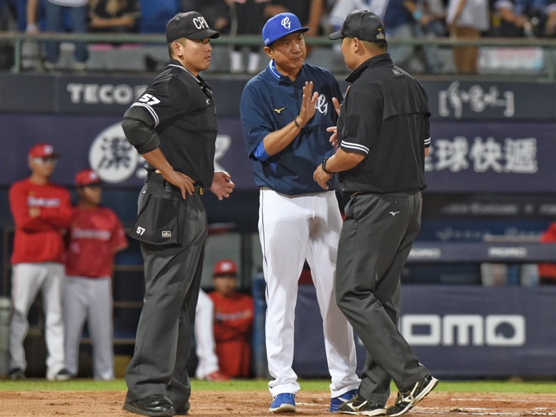 丘昌榮(中)今天比賽中多次上前跟裁判討論。圖/富邦悍將提供