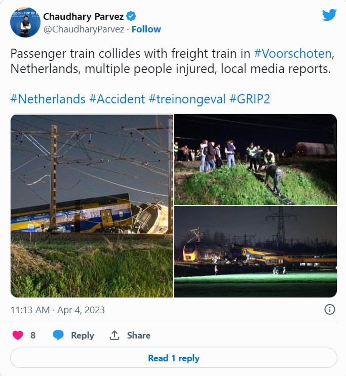 荷蘭火車撞上施工設備出軌起火 多人嚴重受傷 |2023.04.04 語音朗讀 1041觀看次 字級 大 中 小 荷蘭急難部門4日清晨表示,一列至少載著50人的客運列車與一列貨運列車相撞後出軌,並導致後車廂起火,造成數人嚴重受傷。圖/twitter@ChaudharyParvez 【本報綜合外電報導】據路透報導,荷蘭急難部門4日清晨表示,一列至少載著50人的客運列車與一列貨運列車相撞後出軌,並導致後車廂起火,造成數人嚴重受傷。荷蘭新聞社報導,客運列車的最前面一節車廂出軌,並衝進田野,第二節車廂翻倒,最後一節車廂起火。當地急難部門表示,救援隊已抵達位於海牙與阿姆斯特丹之間的小鎮福爾斯霍滕(Voorschoten)事故現場。荷蘭鐵路(Dutch Railways)透過推特表示,由於有事故發生,萊登市(Leiden)與海牙部分地區之間的列車取消。圖/twitter@mvbergen 前一篇文章 英政府運用網軍 打擊武裝分子與假消息 下一篇文章 陸澳貿易官員會談 雙方部長級會面準備 熱門新聞 01華府櫻花綻放 吸引遊客2026.03.2802長照3.0增「互助喘息」 用服務換照顧2026.03.2803穩定物價 4月起電價凍漲 2026.03.2804雲林最炫兒童節 孩童搭乘熱氣球2026.03.2805宜蘭至羅東鐵路高架化 消除9平交道4陸橋2026.03.2806能源漲價 央行逐季檢視通膨2026.03.2807佛光山月光寺啟用 花蓮心靈新地標2026.03.2908推動科學辦案 鑑識權威李昌鈺87歲辭世2026.03.2909俄烏戰燒錢 普亭向俄富豪募款 2026.03.2810塞內加爾紀念碑 闡述販奴黑歷史2026.03.28 訂閱電子報 台北市 天氣預報 台灣一週天氣預報 相關報導 會高市 互擺「龜派氣功」姿勢 日法峰會聲明 確認台海和平重要性川普伊朗戰爭演說 稱任務快完成新生首次到校馬克宏會高市 合建稀土精煉工廠民眾盼停戰睽違53年 NASA載人繞月1日升空