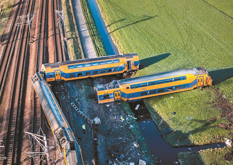 荷蘭火車4日在海牙附近發生出軌事故,車上約有50人,已知至少1人喪生、30人受傷。圖/法新社