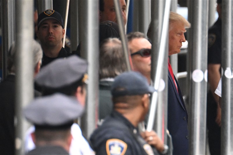 美國前總統川普(右2)4日結束出庭,正離開紐約曼哈頓的刑事法庭。圖/法新社