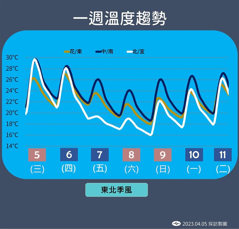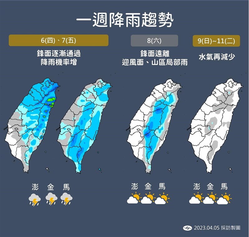 上班日鋒面通過下雨變天 周五降溫北台灣偏涼 |2023.04.05 語音朗讀 2057觀看次 字級 大 中 小 受鋒面影響,上班日要下雨變天了。圖/資料照片 【本報台北訊】今天是清明連假最後一天,把握今天好天氣,明天上班要變天了。明天鋒面逐漸通過中北部,中北部天氣率先轉差,局部短暫陣雨,並且將由北往南逐漸影響,大約到了下午或晚上中部也會受到影響,南部要到深夜或周五。天氣風險公司天氣分析師方俊元上午指出,今天仍會是較悶熱的天氣,中部以北及東部雲量都偏多,局部山區降雨機率也較高一些,南部仍是維持較穩定晴時多雲天氣。方俊元表示,周五隨著鋒面通過後東北季風也隨之增強,北台灣氣溫明顯轉涼,越往南部影響則越小。預估周五還有一波華南雲系將東移,各地都是有短暫降雨機會的天氣,山區因地形影響降雨機會較大。上班日受鋒面影響逐漸下雨變天,北部先下雨,周五全台都有下雨機會。圖/氣象局提供報天氣中央氣象局臉書粉絲專頁指出,明天受鋒面影響,北部、東北部逐漸轉為短暫陣雨的天氣,中部、東部、東南部地區及南部山區亦有局部陣雨,南部平地以多雲為主,雲量增多,氣溫稍下降,但沒下雨時仍悶熱。鋒面帶來到台灣上空,金門、馬祖附近天氣不穩定,有局部雷雨發生機率。周五東北季風增強水氣多,全台有降雨機率,北部、東半部地區、中南部山區局部陣雨,其他地區零星陣雨。降溫明顯,北台灣白天高溫僅20-22度,花東22-25度,中南部仍有26-28度,各地早晚低溫約17-20度間,北台灣整天偏涼。未來一周氣溫變化大。圖╱氣象局提供 前一篇文章 清明疏運台鐵創新高 平均每日疏運70萬人 下一篇文章 全球掀起AI熱潮 博客來「AI」關鍵字周搜尋量破千 熱門新聞 01佛光山365日越文版 贈西貢日航大酒店2026.03.2702紅綠葡萄抗氧化抗發炎 連皮吃獲取健康全效益2026.03.2703台灣工藝3專書 呈現文化獨特樣貌2026.03.2704中職37年 明大巨蛋開幕戰2026.03.2705博鰲論壇 黃循財:支持陸加入CPTPP2026.03.2706南華創校30年 百年樹人邁向永續2026.03.2707照明工具 原理與演進2026.03.2708西半部冬季降雨75年新低 新竹水情亮黃燈2026.03.2709把握遠視儲備期 防兒童近視惡化2026.03.2710人間佛教聯合總會訪三燭寺 互勉弘法利生2026.03.27 訂閱電子報 台北市 天氣預報 台灣一週天氣預報 相關報導 中美並重 鄭麗文傳6月訪美景氣分數衝高 燈號連3紅8萬小草力挺 柯:我不投降 718億新興計畫預算 政院不動 能源漲價 央行逐季檢視通膨京華城案 柯文哲重判17年