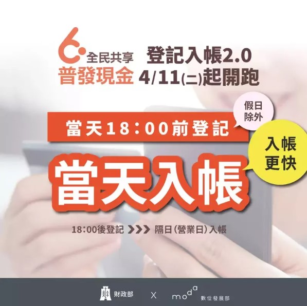 【本報台北訊】登記入帳2.0即將啟動。數位部今(6日)於臉書指出,登記入帳2.0即將於4月11日上線,4月11日起,尚未領普發現金6000元的民眾,只要完成資料登記,經系統檢核帳號資料無誤,當天18點前登記,6000元當天就會入帳,18點後登記,隔日入帳,民眾免出門、6000元更快入帳。